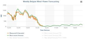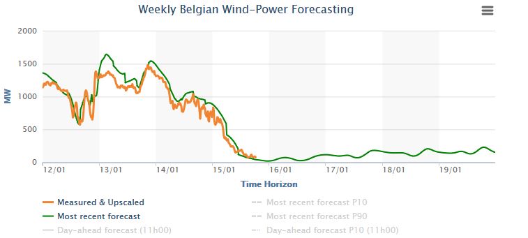 A ce problème lié au grand froid s’ajoute d’autres problèmes: (i) la flotte nucléaire française n’est pas en très grande forme. Plusieurs réacteurs sont à l’arrêt, suite à un problème de concentration excessive en carbone dans leurs générateurs de vapeur. Mais bon, l’Agence de Sureté Nucléaire française semble assez pragmatique et a autorisé EDF à en redémarrer plusieurs ainsi qu’à postposer des contrôles sur d’autres réacteurs vu la situation de pénurie annoncée. Néanmoins, au total on aura cinq réacteurs à l’arrêt la semaine prochaine (ii) Le réacteur de Tihange 1 (962 MW) est toujours à l’arrêt en Belgique (pour les français qui liraient ce blog, je suis belge et donc j’ai tendance à plus me focaliser sur mon pays – et puis il faut de l’électricité pour faire des frites 😉 ). La cause de cet arrêt: une histoire de trop de béton déversé par des ouvriers portugais; histoire qui est encore assez obscure (iii) La centrale TGV de T-Power localisée à Tessenderlo (Belgique) est à l’arrêt à partir de ce lundi pour une opération de maintenance assez longue. Elle a une capacité de 428 MW, soit environ 5% de la puissance électrique consommée en moyenne en Belgique (iv) La Belgique ne sait généralement pas subvenir seule à ses besoins en électricité (v) Il n’y aura quasi pas de vent cette semaine. C’est d’ailleurs le talon d’Achille de l’éolien européen. Quand on a vraiment besoin de beaucoup de puissance électrique en hiver, c’est à dire quand Putin nous envoit une bonne grosse vague de froid, l’éolien ne produit quasi rien. Voici d’ailleurs un petit graphique représentant l’évolution de la production éolienne belge dans les jours qui viennent: