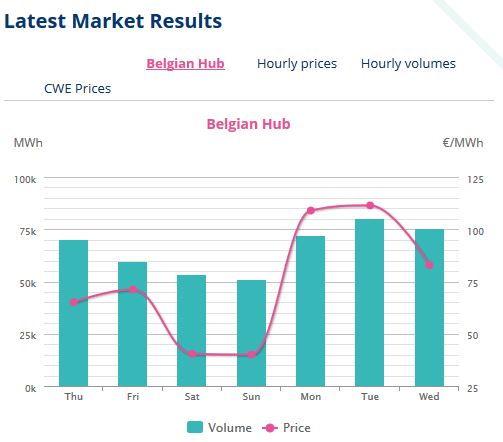 Prix moyen 82.87 €/MWh pour la Belgique. C’est toujours très élevé mais moins que le 111.39 €/MWh observé hier.