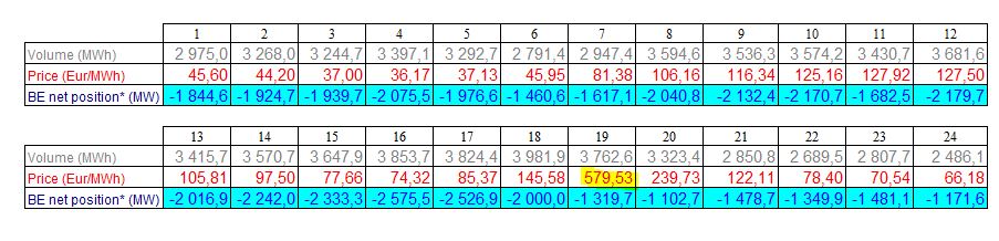 On arrive à un prix maximum de 579 €/MWh pour la Belgique aujourd’hui. Voici le prix heure par heure: