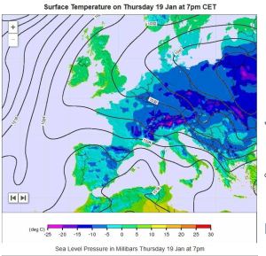 Voici à titre d’illustration la carte des températures prévues pour ce jeudi 19/01 vers 19h, un des moments les plus critiques de la semaine: