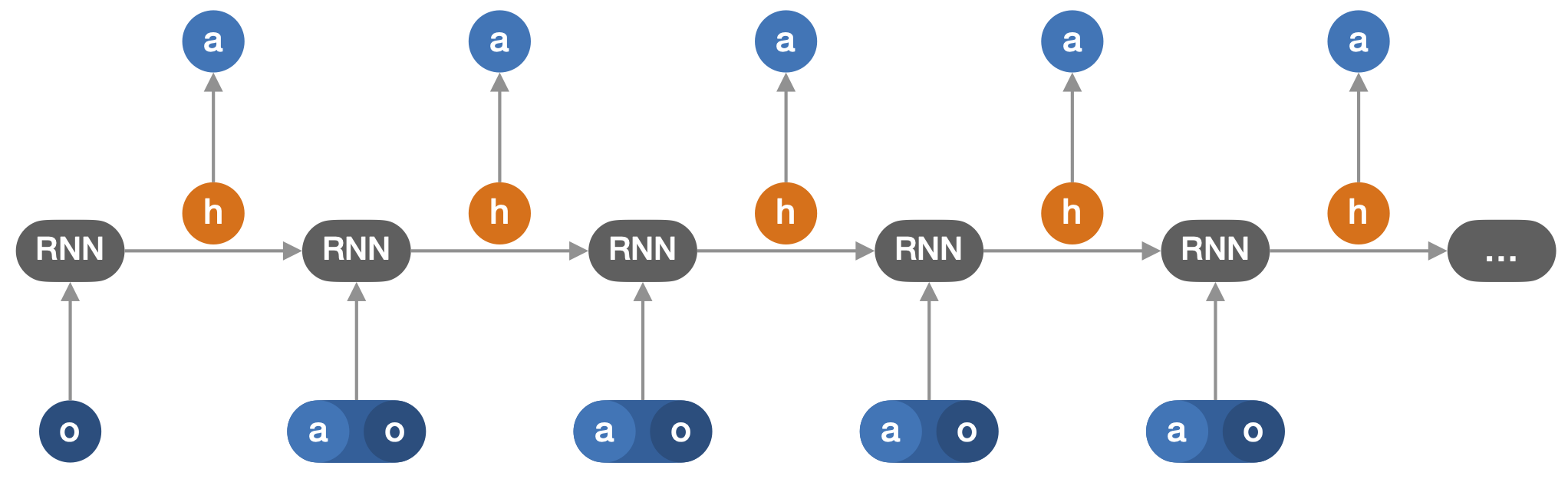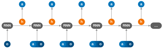 In RL, agents are tasked with finding an optimal policy for choosing their actions based on the history of past observations (o) and actions (a). As a consequence, the agents need to efficiently process that history by memorising and inferring appropriate information in order to act, optimally, at all later time steps. In practice, modern RL algorithms for POEs often model the policy with a recurrent neural network (RNN). RNNs maintain an internal state which is updated each time that a new action is taken and a new observation of the environment is received, as illustrated on Figure 1.