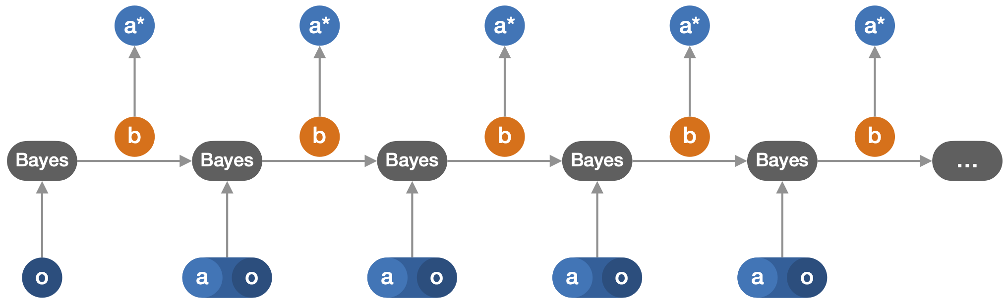 From the theory of optimal control, we know that the optimal policy in a POE can be written solely as a function of the posterior probability distribution of the state of the environment given the history, called the belief (b). In addition, the belief can be updated using Bayes’ rule based on the current belief only when taking a new action (a) and receiving a new observation (o), as illustrated on Figure 2. In other words, the belief is a sufficient statistic from the history for the optimal control at all later steps.