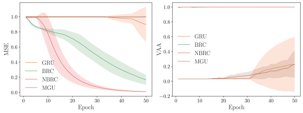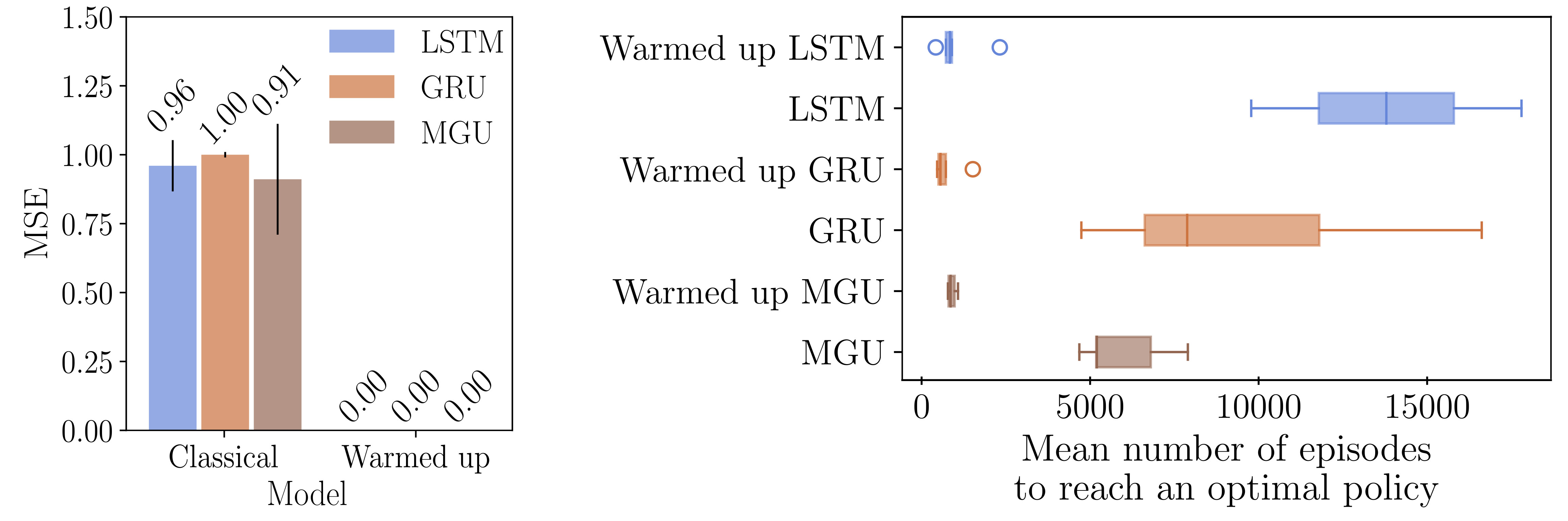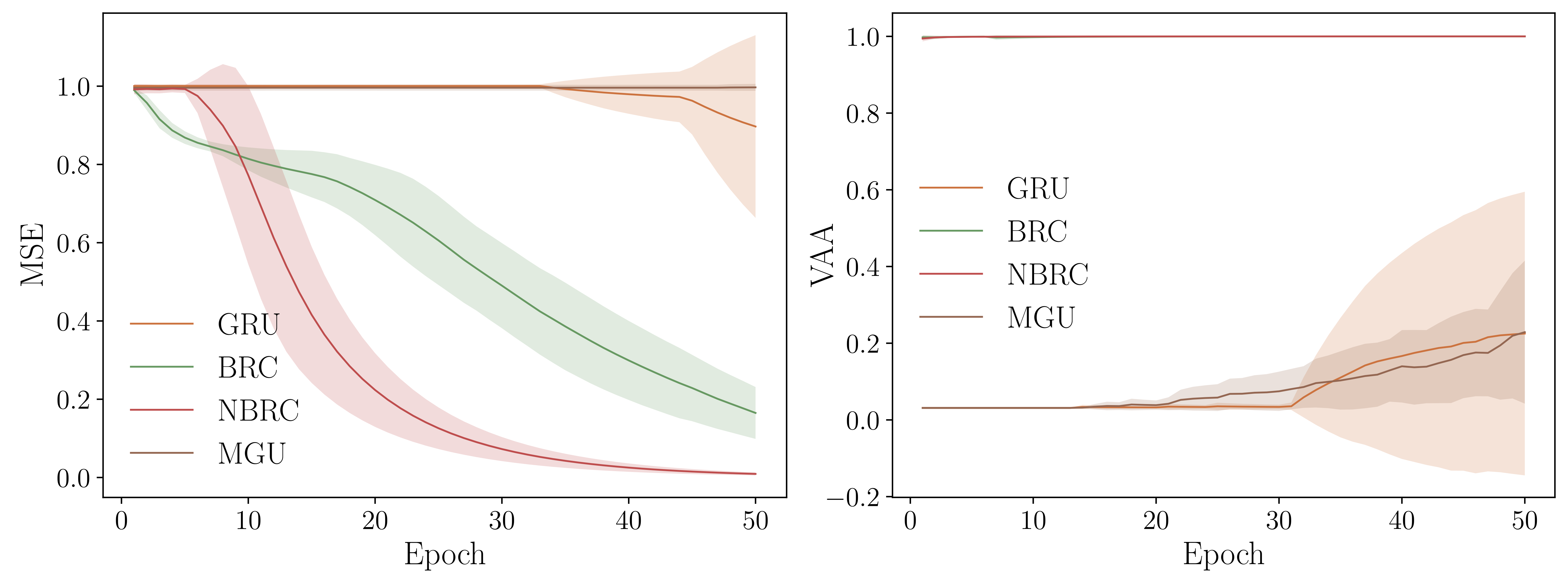The VAA allows us to measure the multistability of a RNN. However, it is not derivable, which prevents from using backpropagation to maximise it. To overcome this issue, we introduce a derivable approximation of the VAA, the VAA*, as well as a new pretraining algorithm, the warmup. The VAA* works similarly to the VAA. The warmup consists in maximising the VAA* of a RNN by performing gradient ascent steps on batches of sequences. Indeed, each batch of sequences is fed to the RNN, which gives us a batch of hidden states. We then compute the VAA* on these hidden states, and finally apply a gradient ascent step on the RNN’s parameters. This process is repeated a number of times, after which the RNN is trained on the actual task. The warmup is shown to improve the learning of long-term dependencies on both supervised and reinforcement learning benchmarks (Figure 2), while being computationally cheap and unsupervised.