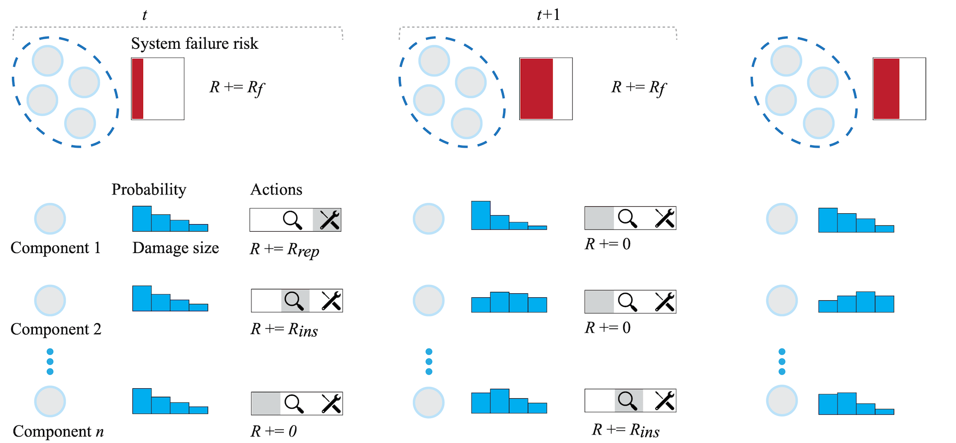 Infrastructure Management Planning (IMP) is a modern application addressing current societal and environmental concerns. In IMP, agents plan inspections, repairs or retrofits to prevent failures in structures like bridges or wind turbines. The goal is to minimise the risk of system failures by considering the probability of failure and the associated consequences. An overarching representation of an infrastructure management planning (IMP) problem is presented in Figure 1.