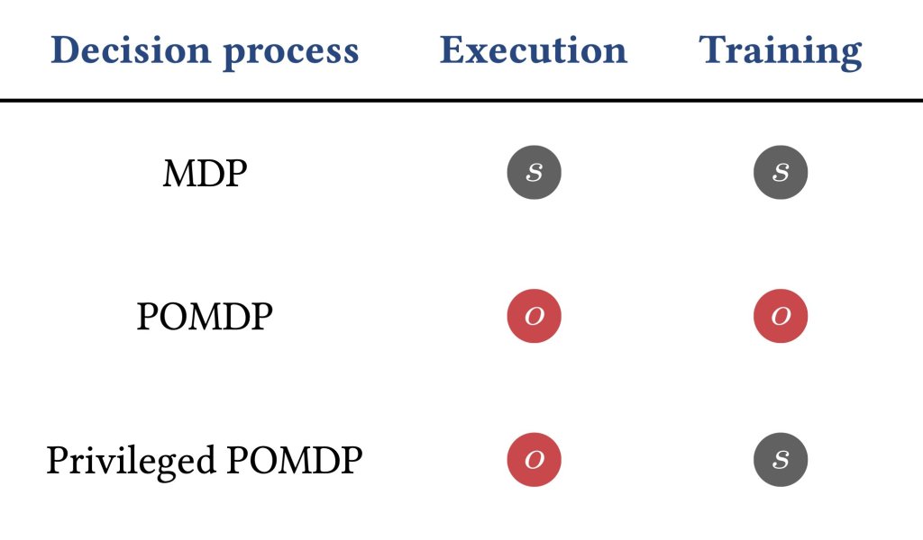 - Privileged POMDP: asymmetric state observability (full at training, partial at execution).