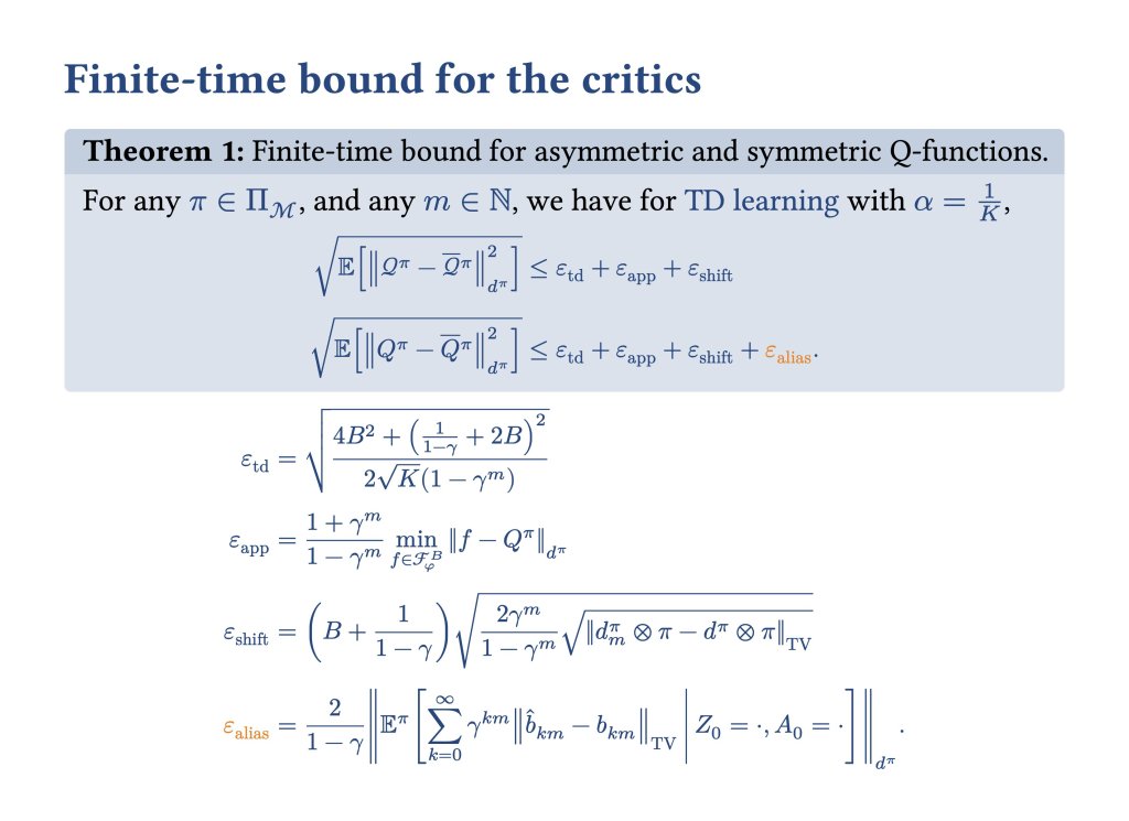 By adapting the finite-time bound from the symmetric setting to the asymmetric setting, we obtain the following error bounds for the critic estimates. The symmetric temporal difference learning algorithm has an additional “aliasing term”.