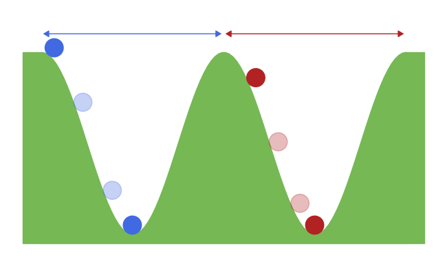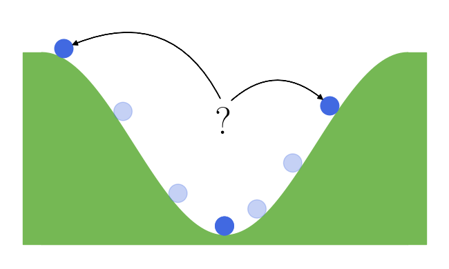One important characteristic of classical RNNs is the dependency between the new state and the previous one. Given the same input but two different previous states, RNNs can compute two different states. This is the core of their memory. However, this is not that trivial with convergent RNNs. Indeed, the reached state does not always depend on the initial one. For instance, let’s take a valley and a ball that is drop somewhere in that valley. No matter the place where it is dropped (= initial state), it will always end up at the bottom (= reached state). This example is illustrated in figure 2 (left). In other words, no information can be transmitted across updates. Fortunately for us, there is a special property of dynamical system that can help us, which is multistability.